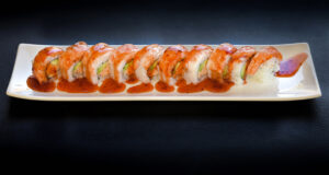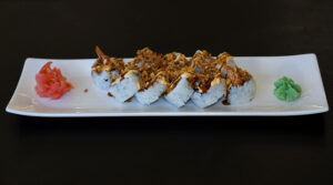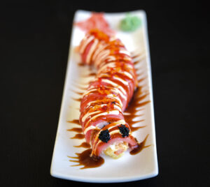 Tuna or salmon, shrimp tempura, avocado, cucumber, eel sauce, spicy mayo and fish eggs