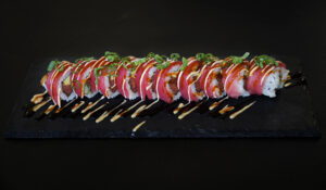 Shrimp tempura, Avocado, Cucumber, Spicy Mayonnaise, Eel Sauce, Topped with Tuna, Masago