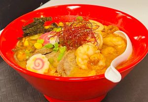 Ramen Noodle, Chicken Curry, Fish Ball, Fried Tofu, Scallions, Half Seasoned Egg, Fried Rice Noodle, Chicken Broth, Fried Pea Powder & Coconut Milk