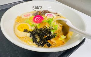 Naruto Fish Cake,Bamboo Shoot,Wood Ear Mushroom, Half Seasoned Egg, Scallions, Roasted Seaweed, Bone Broth and Tonkotsu Paste