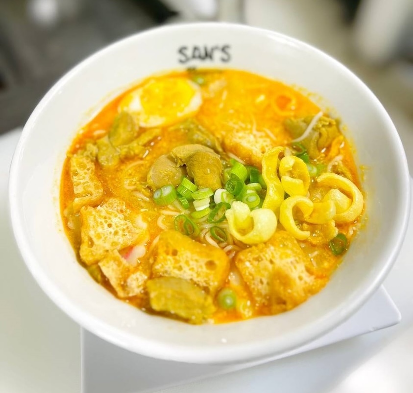 Ramen Noodle, Chicken Curry, Fish Ball, Fried Tofu, Scallions, Half Seasoned Egg, Fried Rice Noodle, Chicken Broth, Fried Pea Powder & Coconut Milk