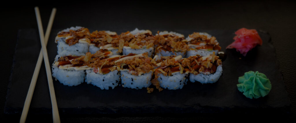 California Roll topping with Crab, Eel Sauce, Spicy Mayonnaise, Fried Onion