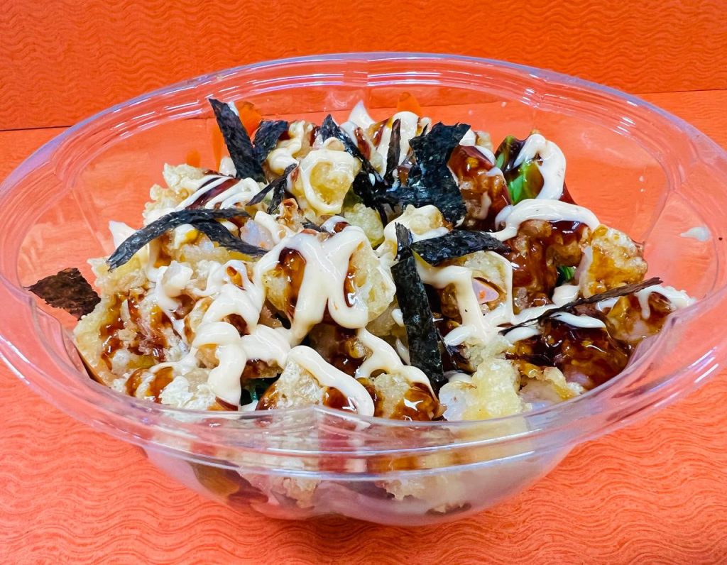 Tuna or salmon, shrimp tempura, avocado, cucumber, eel sauce, spicy mayo and fish eggs